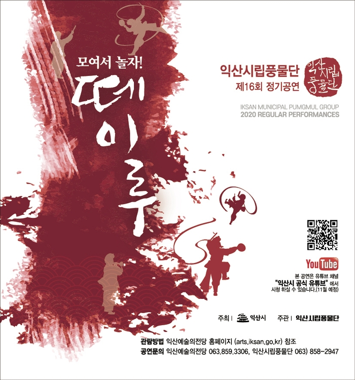 익산시립풍물단(예술감독 김익주)의 제16회 정기공연 ‘떼이루 ~ 모여서 놀자!’가 오는 6일 예술의전당에서 비대면 영상 촬영으로 진행된다.