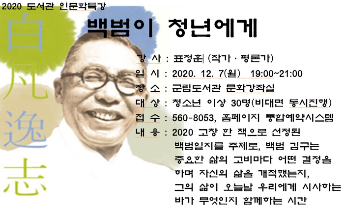 고창군은 오는 7일 오후 7시 고창군립도서관 문화강좌실에서 표정훈 전 한양대 교수와 함께 인문학 특강 ‘백범이 청년에게’를 진행한다.