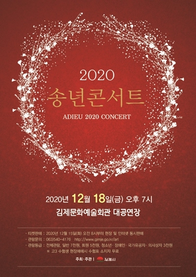 김제문화예술회관(관장 서정아)는 코로나19 장기화로 어려운 시기를 보내고 있는 시민들에게 용기와 희망을 드리고, 조금이나마 힐링의 시간을 선물해 드리고자 오는12월 18일 오후 7시‘2020 송년 콘서트’를 마련했다.