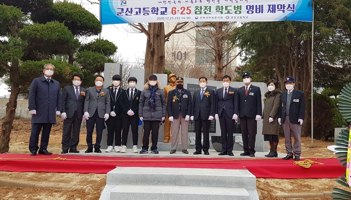 전북서부보훈지청은 23일 군산중고등학교 출신 6·25참전 학도병의 희생과 공훈을 기리는 6·25참전 학도병 명비를 군산고등학교 교정에 세우고 제막식을 개최했다고 밝혔다.