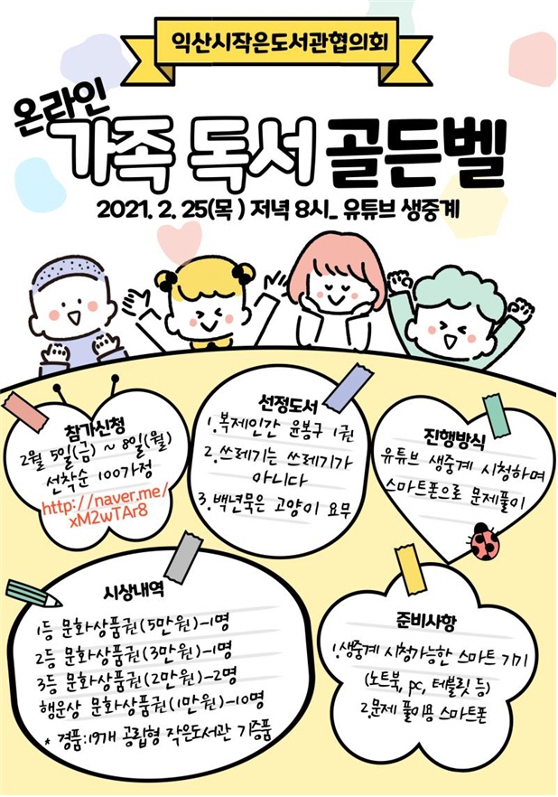 익산시 작은도서관협의회(회장 심준호)는 오는 25일 온 가족이 참여하는 온라인 독서 골든벨 행사를 진행한다.