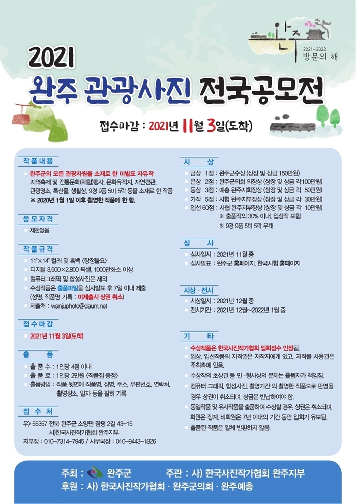 wanjuphoto@daum.net)를 통해 가능하며, 자세한 공모전 내용은 완주군청 홈페이지와 한국사진작가협회 홈페이지를 통해 확인할 수 있다.