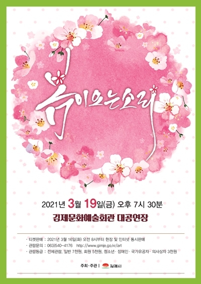 김제문화예술회관(관장 서정아)는 코로나19 장기화로 힘든 시기를 보내는 시민들에게 2021년 새봄을 맞아 위로와 희망을 드리고자 오는19일 오후 7시 30분 ‘봄이 오는 소리’ 공연을 마련했다.