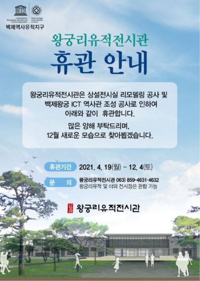전시관 관계자는 “휴관 기간 동안 방문객의 불편을 줄이기 위해 별도의 야외 전시를 준비하고 있다”며 “새롭게 조성될 이번 백제 왕궁 ICT 역사관이 지역주민들의 문화 자긍심을 높이는 멋진 공간으로 거듭날 수 있도록 노력하겠다”고 말했다.