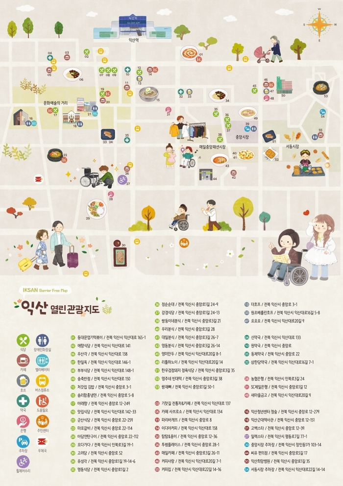 ‘익산역 중심 열린관광 시각자료물 제작’은 익산역 주변 도보관광 활성화를 위하여‘익산 열린관광지도’,‘점자메뉴판’을 제작해 휠체어 이용자, 고령자, 저시력자 등에게 접근 가능한 사업장 정보를 제공하는 사업이다.