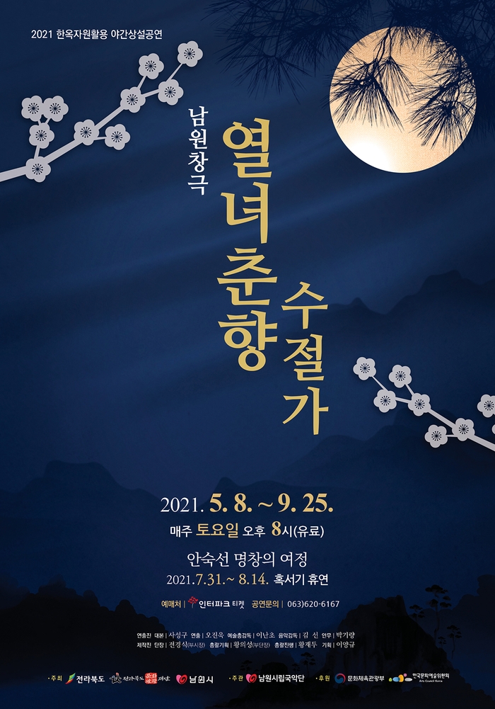 남원시립국악단은 문화체육관광부와 한국문화예술위원회가 후원하고 전라북도 전라북도문화관광재단이 주최하는 2021년 한옥자원활용 야간상설공연 남원창극 [열녀 춘향수절가]로 관객을 맞이한다.