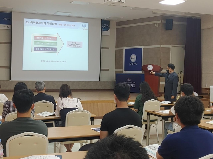 중소벤처기업부와 특허청이 주관하고 한국발명진흥회와 한국창업보육협회가 지원하는 2021년 창업보육센터 연계 맞춤형 지식재산 교육을 군산대 산학협력단 2층 이노테크홀에서 진행했다.