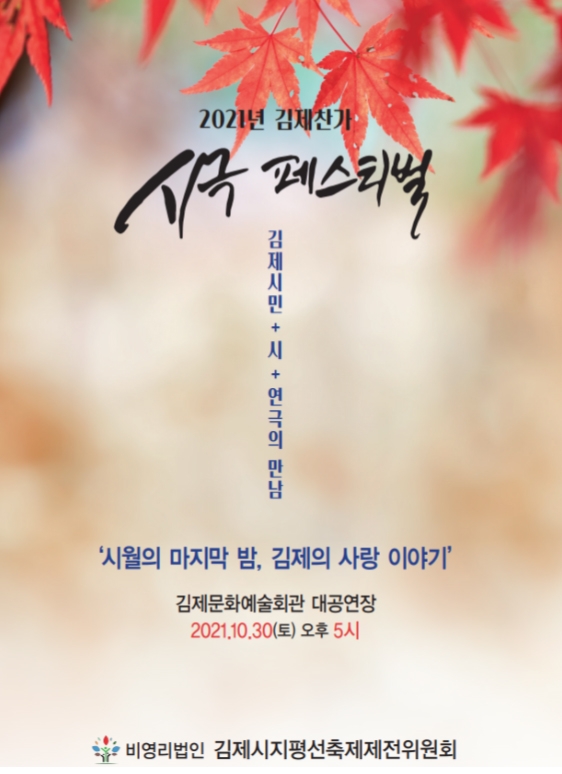특히 사)김제시지평선축제제전위원회(위원장 이재희)는 오는 30일 오후 4시 50분부터 김제문화예술회관 대강당에서 김제 사랑의 멋을 시극으로 살려낸 10월의 마지막 토요일 밤에‘김제찬가, 시극 페스티벌’을 연다. 고 밝혔다.