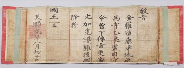 문화재청은 22일 ‘강진 무위사 감역교지(康津 無爲寺 減役敎旨)’라는 이름으로 국가지정문화재 보물로 지정고시 했다.