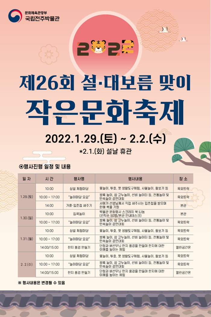 국립전주박물관(관장 홍진근)은 임인년 새해를 맞아 「제26회 설, 대보름맞이 작은문화축제」를 오는 29일부터 2월 2일까지 진행한다.