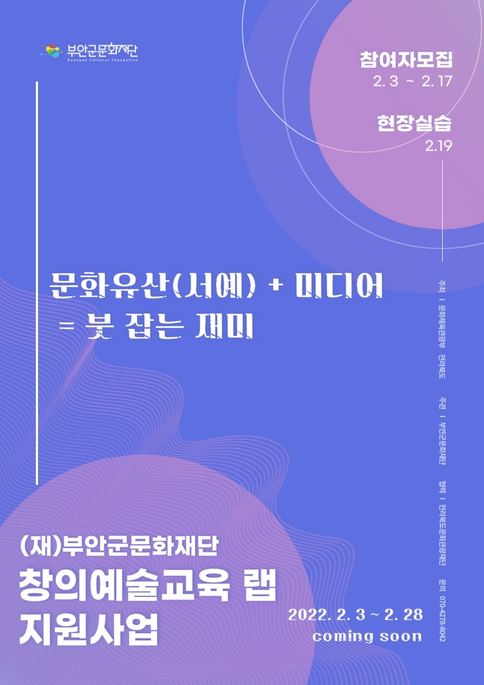 이번 사업은 지난해 전북문화관광재단이 문화체육관광부에서 시행하는 ‘창의예술교육 랩’지원사업 주관기관으로 선정되어 연구개발을 진행한 프로그램의 일환이다. 재단은 ‘문화유산인 서예와 미디어’가 결합된 연구결과보고서를 토대로 부안의 서예와 관련된 역사문화 콘텐츠를 소재로 서예의 역사성과 가치를 담아 진행될 예정이다.