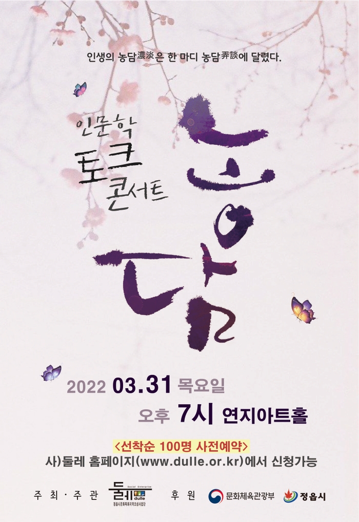 정읍시 문화특화지역 조성사업단을 운영하는 사회적기업 둘레의 인문학 토크 콘서트 ‘농담’이 오는 3월 31일(목) 19:00 연지아트홀에서 진행된다.