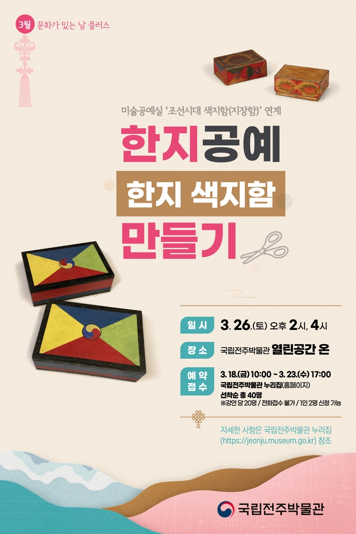 국립전주박물관(관장 홍진근)는 '2022년 3월 문화가 있는 날 플러스 첫 번째 문화행사로 미술공예실 ‘조선시대 색지함(지장함)’ 연계 한지공예 ‘한지 색지함 만들기’를 오는 26일 오후 2시와 4시 전주박물관 열린공간 온에서 두 차례 운영할 예정이다.