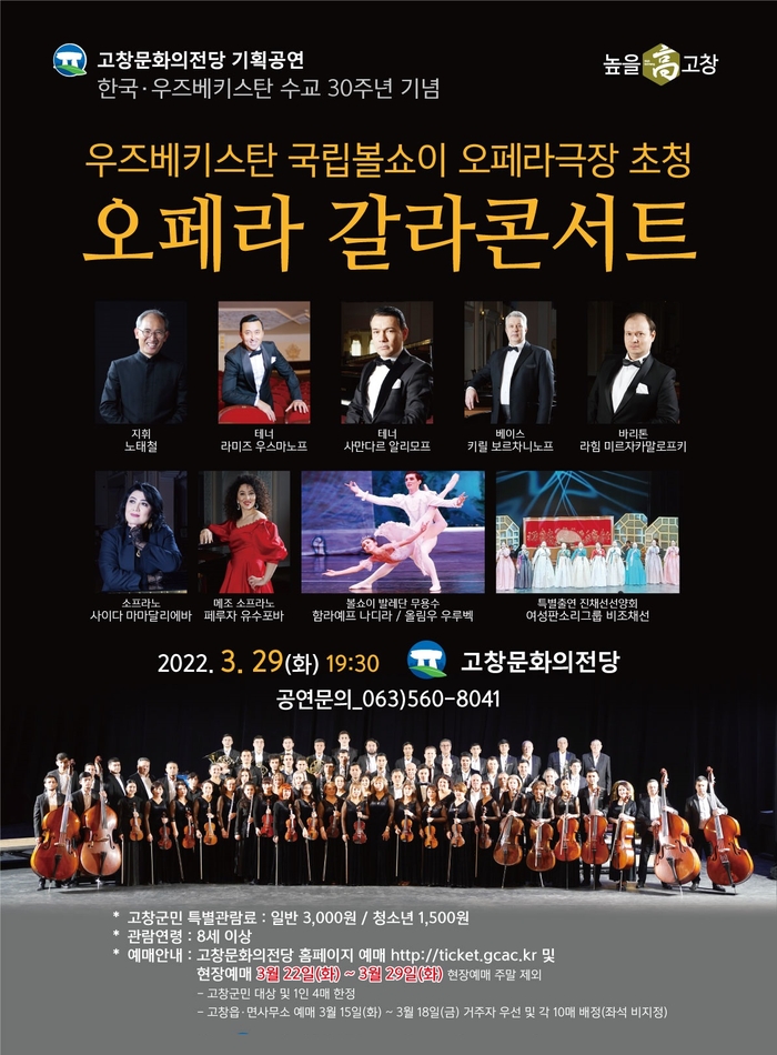 고창군은 고창문화의전당 새봄맞이 기획공연으로 100여년의 역사를 자랑하는 “우즈베키스탄 나보이 국립볼쇼이 오페라‧발레극장”을 초청해 3월 29일(화) 오후 7시 30분, 세계 오케스트라 무대에서 활동하고 있는 노태철 지휘자와 63인조 오케스트라, 성악가 6명, 무용수 2명 등이 협연하는 <오페라 갈라콘서트>를 개최한다.