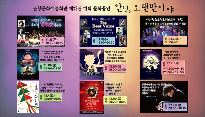 그 밖에 송년 국악잔치(12.4), 한국을 빛내는 목소리(12.8), 발레컬 나의 어린왕자 이야기(12.10), 호두까기 인형(12.18), 아리랑심포니 오케스트라(12.21), 뮤지컬 헨젤과 그레텔(12.23), 박종해 피아노 독주회(12.27)가 시민들과의 만남을 기다리고 있다.