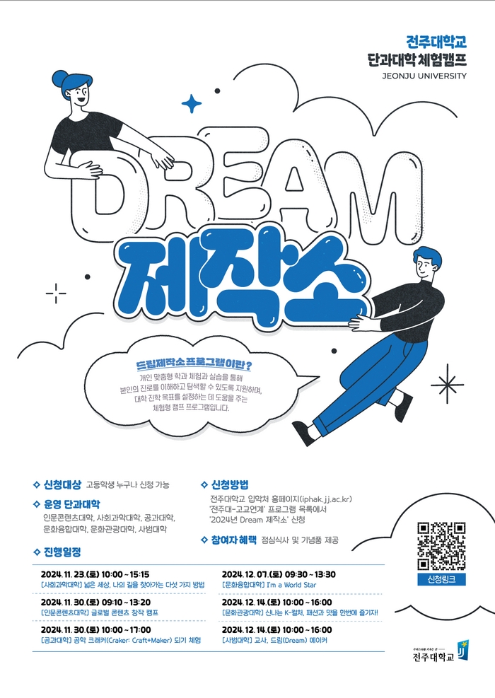 전주대학교(총장 박진배)는 고등학생들의 개인 맞춤형 학과 체험과 실습을 통해 본인의 진로를 이해하고 탐색할 수 있도록 지원하는 체험형 캠프 프로그램인 ‘Dream 제작소’를 오는 23일부터 내달 14일까지 매주 토요일마다 운영한다.