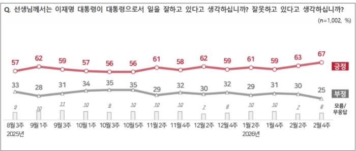 이재명 대통령이 국정 운영을 잘하고 있다는 긍정평가가 67%로 취임 이후 최고치에 이른 반면, 국민의힘 지지도는 장동혁 대표 취임 이후 최저치인 17%로 나왔다.
