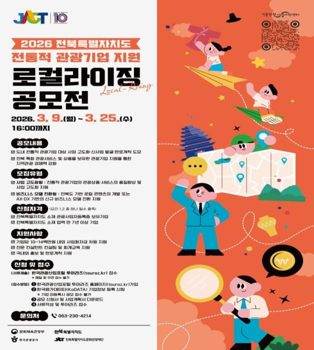 전북특별자치도문화관광재단(대표이사 이경윤, 이하 재단) 전북관광기업지원센터와 전북특별자치도는 오는 25일까지 ‘2026 전북특별자치도 전통적 관광기업 지원 사업 로컬라이징(Local-Rising) 공모’를 실시한다고 밝혔다.