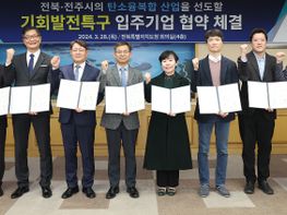 28일 도청 회의실에서 열린 기회발전특구 참여기업 업무협약식(탄소융복합)에 김관영 전북자치도지사를 비롯한 우범기 전주시장, 유경민 한국탄소산업진흥원 본부장, 효성첨담소재, 알피티, 밥스, 티엠시, 하이즈복합재산업...