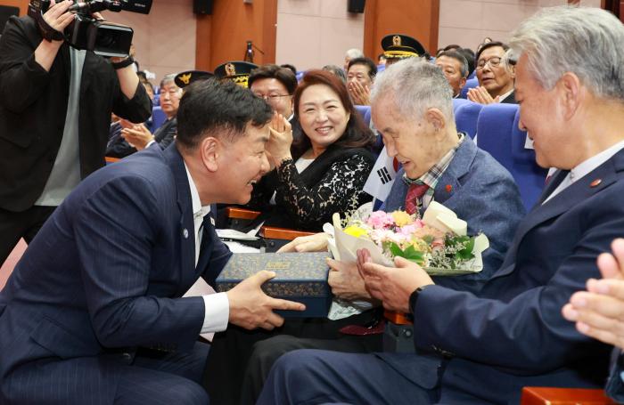 김관영지사가 제80주년 광복절 경축식서 애국지사 이석규 선생에게 꽃다발과 위로물품을 건네고 있다.전북특별자치도는 15일 오전 10시, 도청 공연장에서 도내외 주요 내빈과 국군장병, 보훈단체 회원…