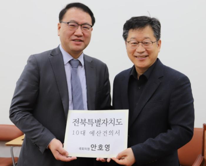 안호영 국회 기후환경노동위원장은 국회에서 지난 11일 유병서 기획재정부 예산실장을 만나 2026년도 전북 주요 예산사업 반영을 건의하고 건의서를 전달했다.안 위원장은 이 자리에서 △피지컬 AI 기반 SW…
