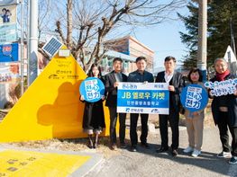 전북은행 ‘JB옐로우 카펫 제9호’가 진안군·읍 진안중앙초등학교에서 4일 조성됐다. 등·하교 학생이 많은 진안중앙초등학교 등·하굣길 교량 위에는 횡단보...
