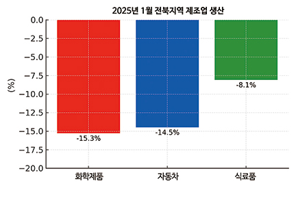 전북 지역 경제가 제조업 생산 감소와 수출 부진 등 전반적인 침체 국면을 벗어나지 못하고 있다.한국은행 전북본부가 최근 발표한 '최근 전북지역 실물경제 동향'에 따르면 2025년 1월 전북지역 제조업 생…