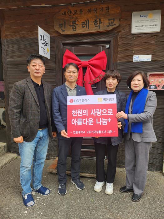 LG유플러스 임직원들이 고위기 여성청소년들의 지원을 위해 정성을 모았다.LG유플러스는 지난 12일 전주시 완산구 동서학동 민들레학교를 찾아 성금을 전달했다고 13일 밝혔다.LG유플러스가 전절한 성금은 '…