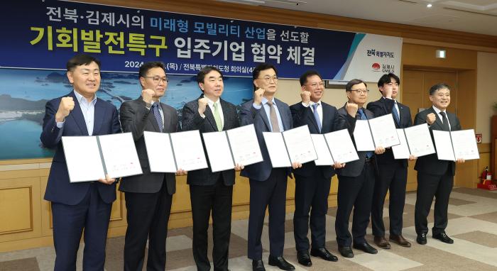 2024-03-28 기회발전특구 참여기업 업무협약전북자치도가 산업통상자원부 주관 ‘기회발전특구 수요맞춤형 지원사업’ 공모에서 최종 선정돼 국비 2억4천만 원을 확보했다.이번 사업은 총 3억6천만 원(국비 …