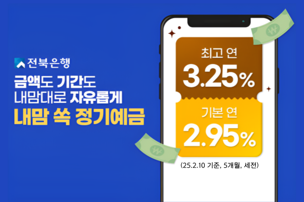 JB금융그룹 전북은행(은행장 백종일)은 오는 31일까지 디지털 전용상품 ‘내 맘 쏙 정기예금’ 가입고객을 대상으로 추첨을 통해 경품을 증정하는 이벤트를 진행한다고 5일 밝혔다.이번 이벤트는 오는 3월 3…