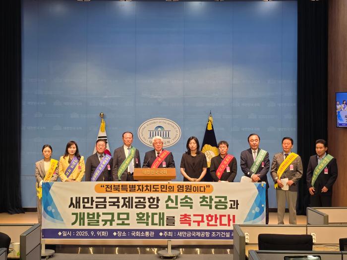 전북건설단체연합회(회장 소재철)는 9일 국토교통부 앞에서 '새만금 국제공항 건설 신속 추진' 촉구 성명을 발표했다.전북건설단체 연합회는 종합건설, 전문건설, 기계설비, 건설기계, 건축사, 소방시설, 엔…