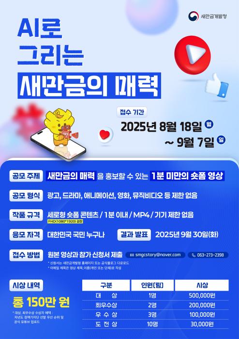 새만금개발청(청장 김의겸)은 새만금의 다양한 매력을 인공지능(AI) 기술로 활용해 담아내는 ‘2025년 새만금 인공지능(AI) 숏폼(짧은 영상) 공모전’을 18일부터 오는 9월 7일까지 개최한다.이번 공모전은 …