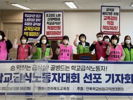 전북학교비정규직 연대회의는 11일 오전 전북교육청 브리핑실에서 학교급식실 환경개선을 요구하는 기자회견을 가졌다. 연대회의 소속 노조원(지부장 최승희, 백승재)들은 이날 기자회견에서 '노동안전 보장 및 환...