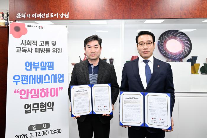남원시(시장 최경식)가 고독사 예방과 복지 사각지대 해소를 위해 남원우체국(국장 오정수)과 현장 밀착형 행정에 나선다.시는 12일 시장실에서 남원우체국과 ‘2026년 안부살핌 우편서비스 사업’ 추진을 …