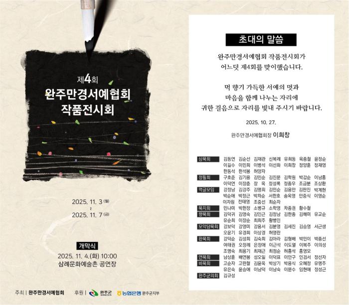 완주군의 대표 서예 단체인 완주만경서예협회(회장 이희창)가 주최하는 ‘제4회 완주만경서예협회 작품전시회’가 3일부터 9일까지 7일간, 삼례문화예술촌 다목적관에서 열린다.이번 전시회에는 완주 관내 9…