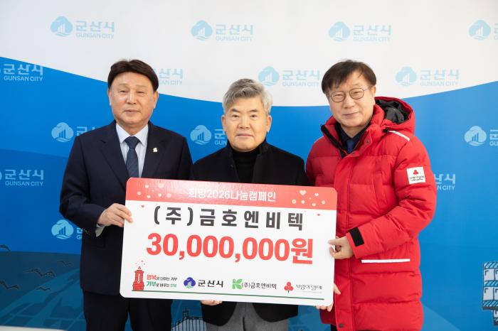 ㈜금호엔비텍(대표 이지태)이 6일 이웃돕기 성금 3,000만 원을 군산시에 기탁하며, 사랑의열매 고액 기업 기부 프로그램인 ‘나눔명문기업’에 이름을 올렸다.‘나눔명문기업’은 누적 기부금이 1억 원 이상…