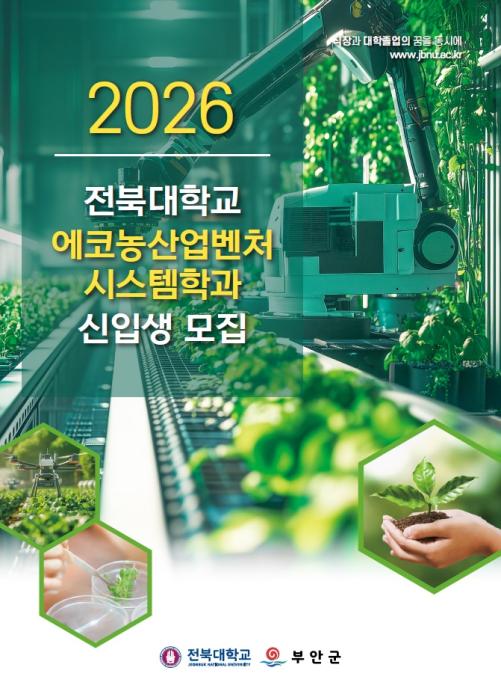 부안군은 미래농산업을 이끌어 갈 전문인력을 양성하기 위해 2026학년도 전북대학교 에코농산업벤처시스템학과 신입생을 모집한다고 밝혔다.이 학과는 지역의 농업 및 산업 발전을 목표로 2021년부터 전북대…
