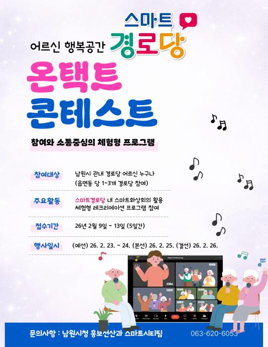 남원시(시장 최경식)는 23일부터 관내 36개 스마트경로당을 대상으로 “온택트 콘테스트”를 시작한다. 이번 행사는 스마트경로당 구축 이후 스마트화상회의 서비스를 활용해 어르신의 비대면 여가복지 프로…