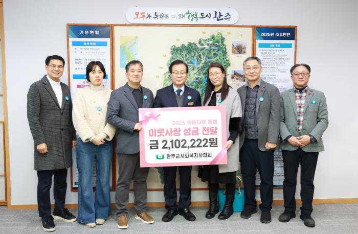 완주군 사회복지사협회(회장 유재현)가 지역 내 취약계층을 돕기 위한 이웃돕기 성금 210만 2,000원을 전달했다.최근 열린 전달식에는 유희태 완주군수를 비롯해 유재현 완주군 사회복지사협회장, 임평화 고…