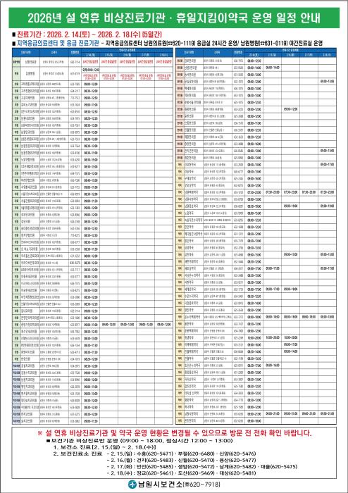 남원시는 설 연휴 기간 발생할 수 있는 응급환자와 경증 질환자에 대비해 2월 14일(토)부터 2월 18일(수)까지 5일간 비상진료체계를 구축·운영한다.이번 비상진료체계는 연휴 기간 의료공백을 최소화하고 …