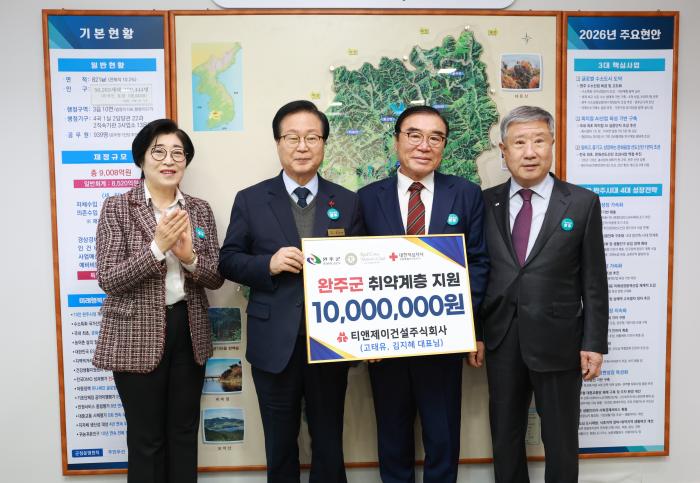 완주군 봉동읍에 소재한 티엔제이건설(주)이 지난 5일 완주군 장애인 체육회에 온누리 상품권 1,000만 원 상당을 기부하며 완주군 장애인 체육발전과 취약계층 지원에 힘을 보탰다.티엔제이건설은 1997년 설…