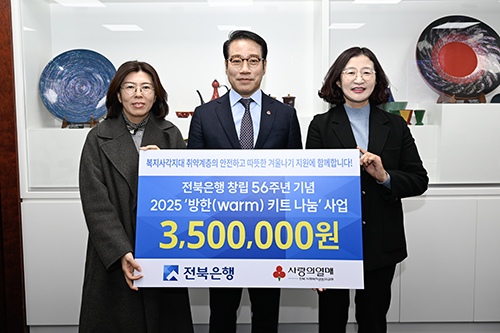 남원시(시장 최경식)는 지난 26일 JB 전북은행이 지역 내 취약계층을 위해 ‘따뜻한 겨울나기 방한키트’ 80박스를 기탁했다고 밝혔다. 전달식은 남원시청 시장실에서 열렸으며, 전상익 전북은행 부행장, 박…