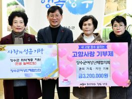 장수군여성단체협의회(회장 김광순)은 28일 장수군에 이웃돕기 성금 100만원을 기탁하고 고향사랑 기부제 홍보에 동참했다. 장수군여성단체협의회 13명의 회원들은 지난 7월부터 월례회의 때마다 고향사랑기부제를 적극 ...