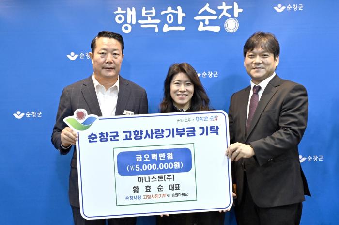 순창군은 22일 하나스톤㈜ 황효순 대표이사가 고향사랑기부금 500만 원을 순창군에 기탁했다고 밝혔다.하나스톤㈜는 기초석 및 구조용 콘크리트 제품을 전문 생산하는 기업으로, 2017년 순창군 팔덕면에 공…