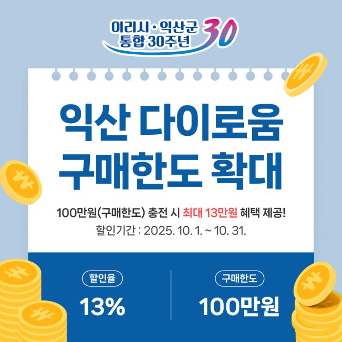 최대 23%의 혜택이 주어지는 익산 다이로움이 10월 한 달간 구매 한도를 확 늘린다.익산시는 이리시·익산군 통합 30주년과 시민의 날(10월 3일)을 기념해, 10월 한 달 동안 지역사랑상품권 '다이로움'의 월…