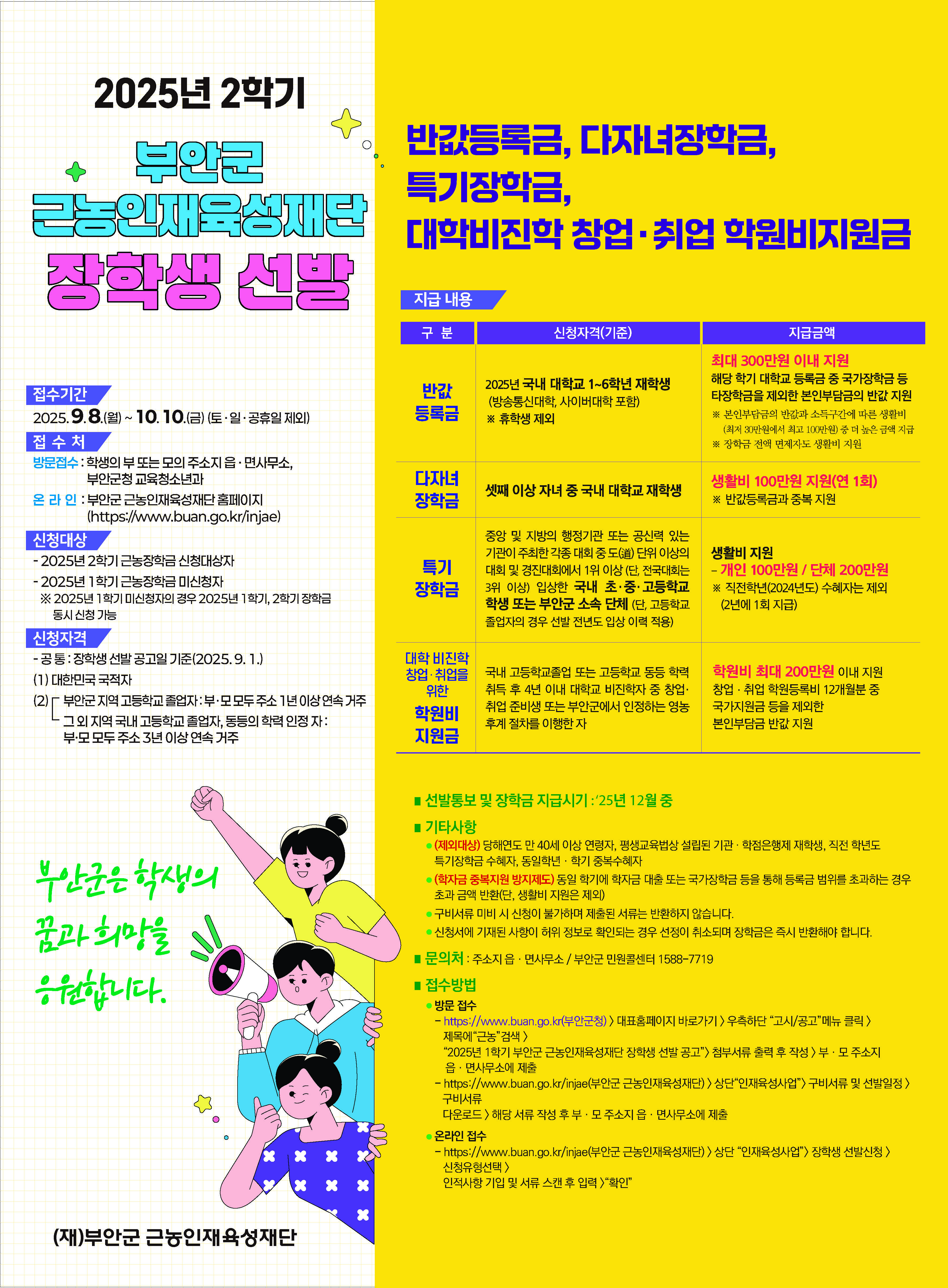 부안군 근농인재육성재단(이사장 권익현)은 2025년 2학기 장학생 신청 접수를 위해 각종 홍보자료를 준비하고 온라인 접수 시스템을 정비하는 등 장학금 지급 준비를 모두 마쳤다고 밝혔다.장학금 신청 기간…