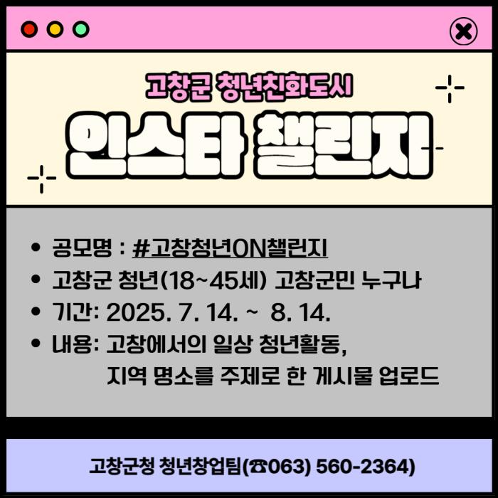고창군이 청년의 시선으로 바라본 지역의 매력을 담기 위한 ‘고창청년 ON 챌린지’ 사진‧영상 공모전을 개최한다.이번 공모전은 청년들의 일상과 활동, 그리고 고창의 자연과 명소 등을 주제로 다양한 콘…