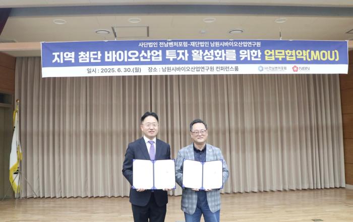 남원시바이오산업연구원(원장 이영철, 이하 산업연구원)은 지난 6월 30일 전남벤처포럼(회장 황헌수)과 지역 첨단 바이오산업 투자 활성화를 위한 업무협약을 체결했다고 밝혔다.이번 협약은 전북지역 유망 …