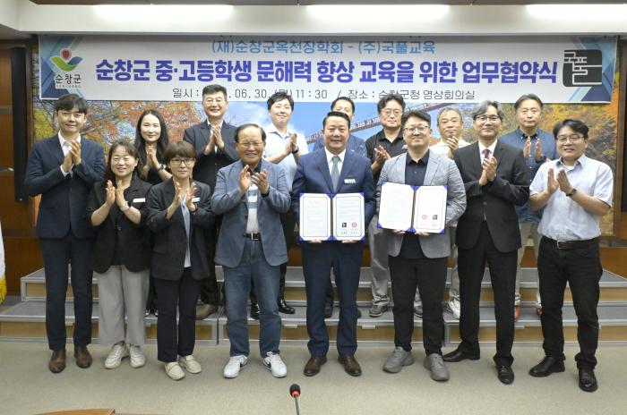 순창군은 지난달 30일 군청 영상회의실에서 (재)옥천장학회(이사장 최영일 순창군수)와 국어교육 전문기업 ㈜국풀교육(대표 최용운)이 중‧고등학생 문해력 향상 교육을 위한 업무협약(MOU)을 체결했다고 밝…