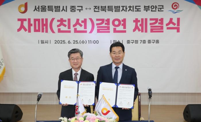 전북 부안군(군수 권익현)과 서울 중구(구청장 김길성)가 양 도시 간 우호협력증진 및 공동발전을 도모하기 위하여 25일 서울특별시 중구청에서 친선결연 협약을 체결했다.이날 협약 체결식에는 권익현 부안…